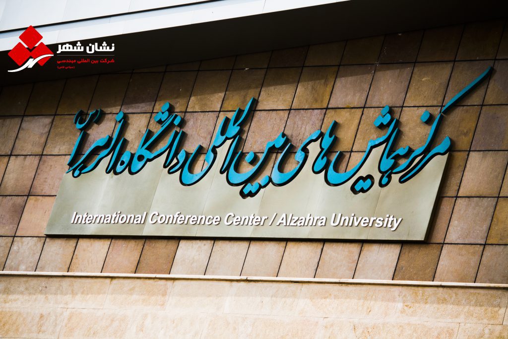 در ساخت و نصب تابلو دانشگاه الزهرا از متریال کامپوزیت طلایی و حروف برجسته فلزی با رنگ الکترواستاتیک استفاده شده است.